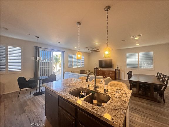 Enjoy a spacious open floor plan with a gourmet kitchen boasting granite countertops, stainless steel appliances, a large island with bar seating, and a stylish backsplash. The kitchen flows into a bright dining area and living room with plantation shutters, recessed lighting, and a sleek ceiling fan—perfect for everyday living and entertaining.