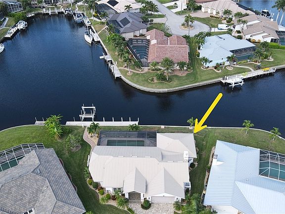 Coastal Paradise in Punta Gorda Isles – Sailboat Access, Tip Lot & Sunset Views! High and dry at 10.2' elevation — no flood damage here! This beautifully updated 3-bedroom, 2-bath waterfront retreat captures the essence of easy coastal living with style, comfort, and stunning water views. Perfectly positioned on a tip lot at the end of a quiet cul-de-sac with 146’ of waterfront, this home offers 270° water views, a 70-foot concrete dock, and a new 14,000-lb boat lift (2023) with sailboat access—no bridges! In just 5–10 minutes, you can cruise to Charlotte Harbor through scenic Buckley Pass. A shore power pedestal with 110 & 220, 30-amp service makes boating a breeze. Step inside to a bright, open layout filled with natural light and Plantation Shutters. The expansive saltwater pool and lanai area becomes your private oasis—perfect for entertaining, relaxing, or soaking in breathtaking western sunsets. Hurricane shutters add both security and shade with the touch of a button. A paver driveway and tropical landscaping create a welcoming coastal curb appeal, while the split-bedroom floor plan ensures comfort and privacy for guests. Recent upgrades include: New metal roof (2024) with gutters & downspouts, New HVAC (2022) for year-round comfort, New pool pump & heater (2021), Fresh interior paint, new carpet (2024) in guest room, and updated landscaping (2023), Panel wired for Generator, Whole House Water Treatment System. When you’re not lounging by the pool, head down the paver walkway to extended dock.... launch a kayak, paddleboard, or cast a line right from your backyard. You’re also just minutes to downtown Punta Gorda’s waterfront dining and boutique shopping.. Move-in ready and meticulously maintained, this coastal sanctuary invites you to live the good life—where every day feels like a vacation. ****PLEASE ENJOY THE 3D VIRTUAL TOUR****