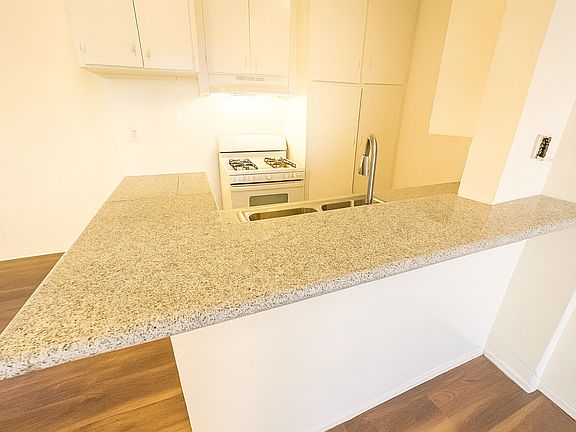 Brand NEW granite kitchen counter with NEW stainless steel kitchen sink and NEW Hotpoint Stove with range.