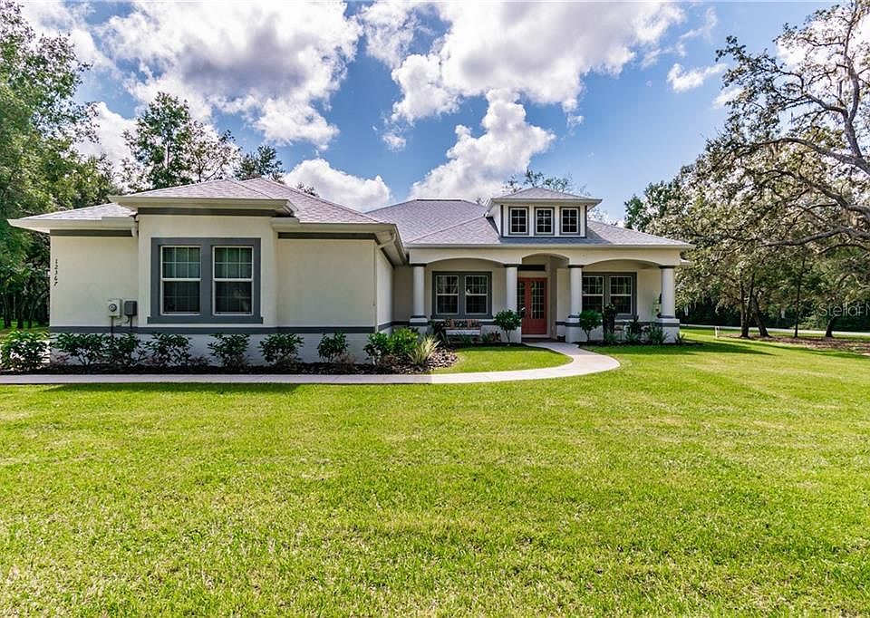 One-of-a-kind custom built Rotunda home located on 1.04 acres in Pasco County is ready for new owners! Built in 2019, this well appointed estate home offers you 4 Bedrooms (2 MASTER BEDROOMS), 3 full bathrooms, a den/office/media room and an amazing kitchen. This gem is located on a corner lot, facing north, on a semi-private street in the popular gated community of Quail Ridge. The foyer greets you with tall ceilings and impeccable crown molding. Modern and durable wood-like tile flooring flows throughout the entire main living area. The living room is completely open with added tray ceiling and relaxing views and by simply opening up the french doors to the lanai, it can continue to the outdoors. The kitchen drips in luxury with a custom glass tiled backsplash and island front, MARBLE countertops, soft close/light cabinets with antique gold hardware, Frigidaire stainless steel appliances to include a chefs refrigerator with ample top to bottom freezer/refrigerator space. 8' x 4" marble island with breath-taking coffered ceiling above is a statement piece. Cafe area is large enough for a dining room table. Large walk-in pantry with great depth and double doors. The owner's retreat is private with tray ceiling/natural light and the ensuite offers his and hers sinks with a lower vanity, MARBLE countertops, modern center soaker tub and walk through ceiling to floor tiled shower with 2 shower heads and 2 niches. There is a great flex space up front off of the living room that can accommodate several lifestyle purposes such as a media room, an office, a den or a 5th bedroom. Once down the hallway, you have the laundry room with built in cabinets and a marble countertop for folding, you encounter 2 more bedrooms with plenty of closet storage that share a full bathroom tastefully designed. On the other side of the home and tucked away behind the kitchen, you have the 2nd master bedroom. This room is just as large with beautiful private views and a full ensuite bathroom with dual sinks, marble countertops, walk in shower AND a large walk-in closet. Your exterior living offers a perfectly sized covered and screened-in lanai facing south in addition to the long covered front porch ideal for relaxing, conversing and watching the local wildlife. This home is on well water, so no water bill, with a water softener in place. In addition to all of the spectacular upgrades, the 3 car garage has 10' doors for tall vehicles and extra storage space, epoxy flooring and several built-in storage shelves. This home has full irrigation on the entire acreage added by homeowner! You also get a "court yard" driveway for even more space! Great schools both public and private nearby. Quail Ridge offers 3 miles of paved walking/biking trails inside the neighborhood as well as being only 1 mile from the Suncoast Trails. It is about 35 minutes to Tampa International Airport as well as downtown Tampa. Head west along state road 52 for 25 minutes and you'll arrive at some of the best local beaches along the gulf. This home offers the "rural" feeling with the big city life only minutes away. Please view the Matterport video to get a more personal showing!