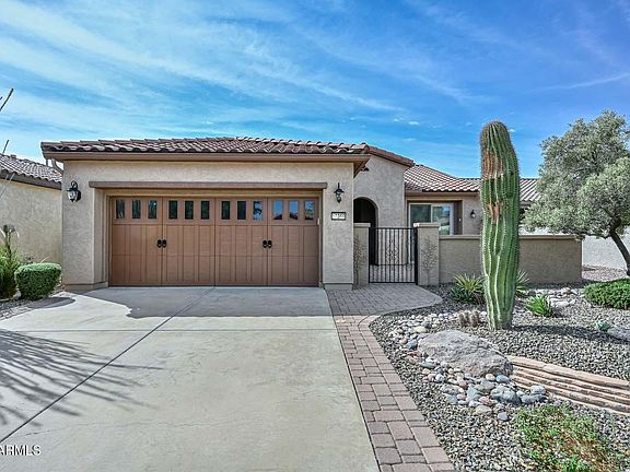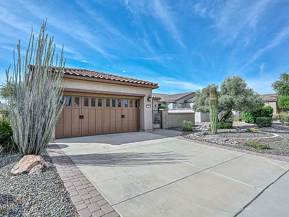 Absolutely stunning Flora model with an open floorplan and lots of windows that create natural light. It is in a great locations.. North/South exposure. Entertain in the beautiful South-facing backyard or use the North-facing courtyard in front. Back is covered patio but allows for beautiful desert landscape views. Fantastic floor plan with a generously sized kitchen with plenty of cabinets with pull outs, storage, and an island. Granite counters complement the stainless-steel appliances, gas stove. Two bedrooms have plenty of room and closet space.A built-in office. Primary suite has a walk-in closet & sliding glass door to backyard patio. Exterior just got painted, roof in 2022, water softener, newer a/c, fenced in backyard, This home is move in ready just awaiting you!