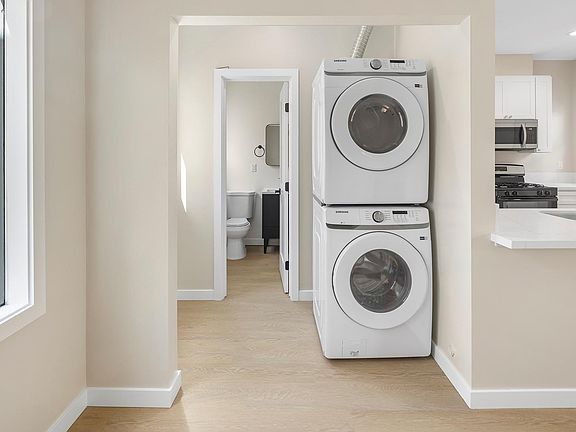 Natural lightDesigner fixturesOpen floor planCountertop dining areaStainless-steel appliancesSleek stainless-steel appliancesFull-size washer and dryer