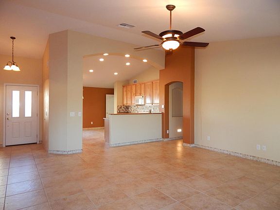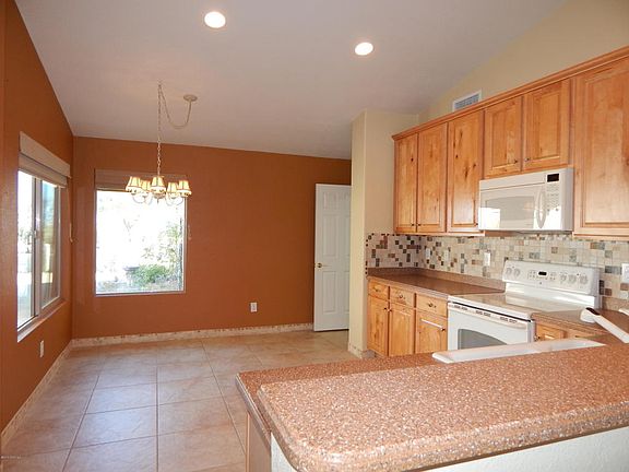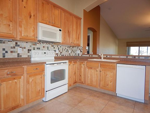 This gorgeous home has desirable upgrades and features in every direction inside and out! The home is 2169 sq. ft. with two bedrooms, two baths and a den in the main house complemented by a stunning guest casita with third bath. The 16x16 tile is neutral with an attractive mosaic baseboard that is well balanced by warm laminate flooring in the bedrooms. The kitchen has knotty maple cabinets with pull-outs, custom stone backsplash and is open to the living area making it ideal for entertaining. The laundry room has lots of cabinets and leads to the extended two car and golf cart garages. The den has deluxe built-in desk and shelving unit and looks out to the beautiful backyard landscaping. The master suite has a slider to a screened patio with hot tub!