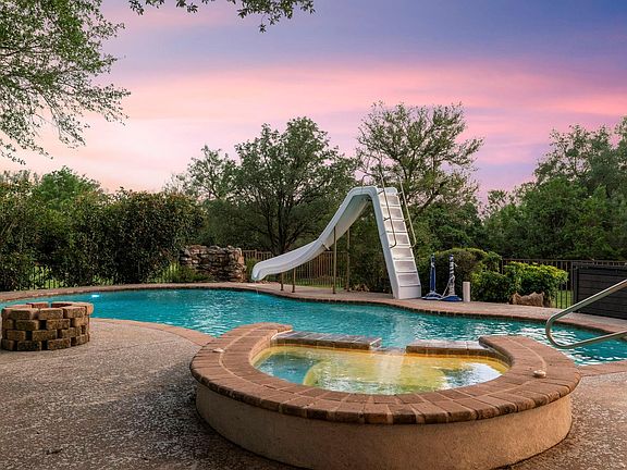 Serene hill country living in the gated, waterfront Ridge Harbor community in dreamy Spicewood, TX. Enjoy top-notch amenities: pool, tennis & basketball courts, playground, marina, boat ramps, waterfront park, access to excellent Marble Falls ISD schools, and a low 1.35 tax rate. This spacious 3,298 sq ft home sits on 1.37 acres with a private backyard oasis featuring an inground pool, spa, and a viewing deck with breathtaking Lake Travis and sunset views. Surrounded by mature landscaping and shade trees, the backyard includes a fenced bonus yard backing to wooded space for added privacy. Inside, you'll find 6 bedrooms, 3 full baths, formal dining, multiple living areas, and a bright kitchen with soaring ceilings, crown molding, recessed lighting, wood flooring, and large windows framing the stunning hill country landscape. The formal living and dining rooms boast a cozy wood-burning fireplace. The kitchen opens seamlessly to the family room and boasts granite countertops, stainless steel appliances, wraparound bar seating, and timeless cabinetry. The thoughtful floor plan includes a private primary suite with ensuite bath, three closets, and walk out access to the back deck. Three secondary bedrooms with stained concrete floors and a shared dual vanity bath are located in the front wing, along with a large game room. Two additional guest rooms and a third full bath are situated on the opposite side of the home. Designed for entertaining, the backyard features a huge, covered deck, pool & spa, pergola-covered cabana, fire pit, and a spiral staircase leading to a scenic rooftop viewing deck. The bonus fenced-in yard offers ample space for recreation. Easy access to Hwy 71, Spicewood Airport, Muleshoe Bend, Krause Springs, Barton Creek Country Club, Luck Ranch events, and more. Just 20 minutes to Marble Falls, 30 to Lakeway, and under an hour to Downtown Austin. Don’t miss this rare opportunity in one of Spicewood’s most sought-after communities!