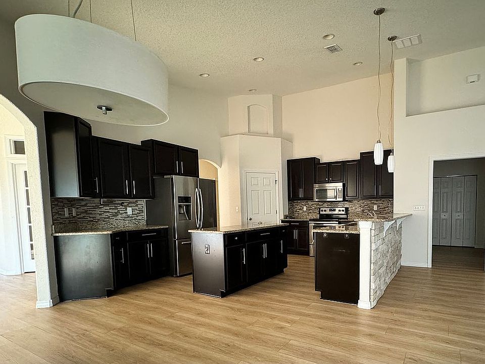 This beautiful single family home is situated on a double lot with a circular drive in a great family neighborhood. Fresh new paint on walls, doors and ceilings. New luxury vinyl all throughout the house. New landscaping. Beautiful upgrades all around. The home has 4 bedrooms (2 masters!) and 3 full baths. The 4th bedroom is alternate den/office; 5 minutes from Charter Schools, Publix, Fresh Market, Walmart, restaurants, banks, gas stations, shopping, and more. Private fenced in yard that has it's own access to basketball, tennis, volleyball court, and kids play area. Spacious gourmet kitchen, granite counters, upgraded cabinets, pantry, opens to family room & eat-in nook area. Custom tray ceilings in dining room & master. Cabana bath w/upgraded tile and upgraded walk-in shower. Main Master bath has huge shower with bench and TWO shower heads.