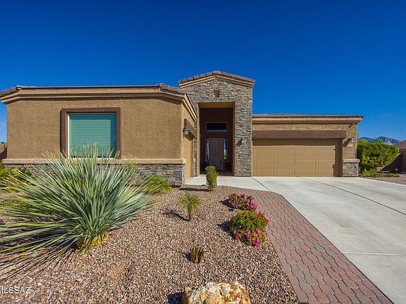 Gorgeous D.R. Horton former model home w/ breathtaking views of Pusch Ridge! Beautifully designed 2,534 sq.ft home offers 4 BR 3 BA & flex room on a spacious .295 acre lot. A light-filled foyer opens to a spacious greatroom which flows to a covered patio w/double sliders. Enjoy 10 ft ceilings, custom paint & designer window coverings. The chef's kitchen features an oversized center island, gas cooktop, double convection ovens, farmhouse sink, granite cc'tops,42'' cabinets, pendant lighting & walk-in pantry. The spacious primary suite boasts double-door entry, luxurious bath w/oversized shower & garden tub w/fabulous views.Rolling shutters in primary bath, dining area & patio. The resort-style backyard includes a heated pool w/water feature, lagoon, 3 swim-outs, outdoor kitchen w/BBQ. Spa. 4 umbrella inserts for pool. Artificial turf. Citrus trees. Front & back on irrigation w/timer. 3 car split epoxy garage floors. Walk-in lighting front & back. Additional pavers on front north side w/lighting for extra car parking. The latest in home technology and automation. The views and location are stunning. In the heart of Oro Valley close to all amenities.