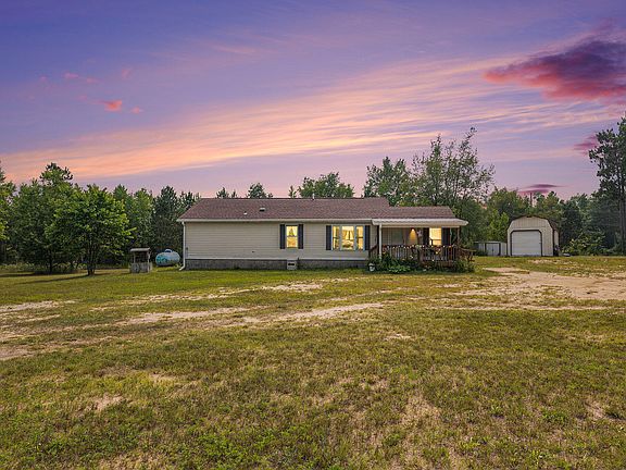 NEW PRICE TODAY, SELLER MORTIVATED.!!! All the renovations have been completed, new vinyl plank flooring, new trim, fresh paint, new roof, new leaf gutters, new chain link fence in back too. Country home just west of downtown Kaleva. Single wide section 14x54 and stick built addition 12x40 expanding the living room and making way for a 3rd bedroom. Large dining and kitchen area, laundry in the hallway just off the bathroom. Sliders off the living room that go out to the back yard area where there are 3 storage sheds and a 3 stall detached garage with a shop area inside that is 8'x14'. the acreage is mainly level and goes all the way down the Horseshoe Creek road. Covered front porch and more. Plenty of room for animals and a great garden as well. Schedule a private showing today.