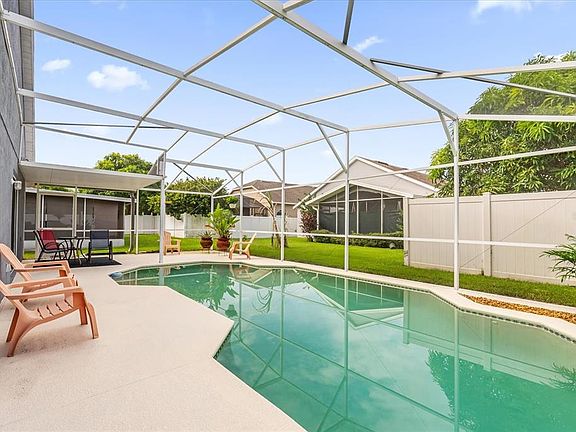 Step into this move-in ready gem and be greeted by elegant formal living and dining rooms, perfect for entertaining. The upgraded kitchen boasts GE stainless steel appliances, granite countertops, a center island, and soft-close drawers—a true chef’s delight. The open layout flows into the family room, complete with 5.2 sound system wiring and an abundance of natural light. Retreat outdoors to your private screened pool, offering the perfect balance of relaxation and entertainment. This 4-bedroom, 2-bath home features laminate flooring in all bedrooms and 20x20 ceramic tile throughout the main living areas. Best of all, with an accepted offer, this home is available partially furnished for a seamless move-in experience.