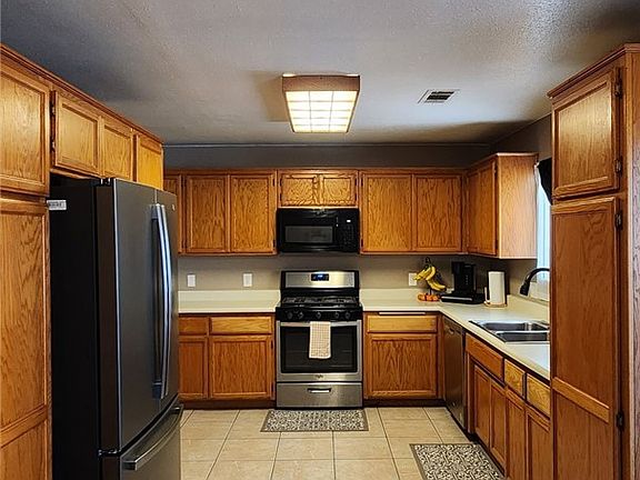 The updated kitchen features newer stainless steel appliances, ample counter space, and generous cabinet storage. It opens to a cozy dining area, perfect for entertaining or family meals.