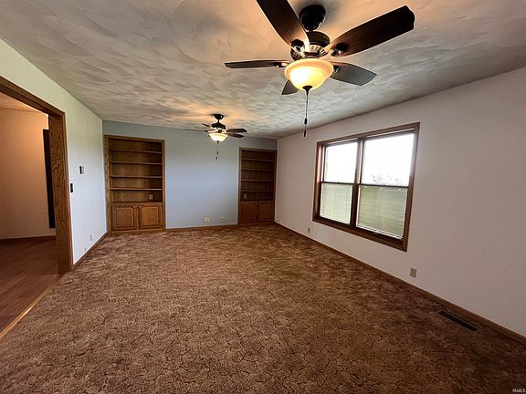 Spacious, All brick, 1853 S.F. Ranch on 2.04 Acres conveniently located just off Hwy. 24 before you get to Wabash. This home offers an attached oversized 2-car garage, 3 large Bedrooms and 2 1/2 Bath. The Primary bathroom has been beautifully remodeled with an updated tub with shower with glass doors, vinyl plank flooring and a twin sink vanity. Don't miss the Chef's kitchen with built-in pantries and a moveable center Island. Other cabinets feature pull-out shelves. Dishwasher, disposal and Range stay. There is a water line for the refrigerator and a microwave shelf. Pella Double-hung windows with slim shades throughout. A Heat Pump has been added for an additional heat source and Air Conditioning to supplement Electric Ceiling Cable heat. This home has been in the family since it was custom built in 1992. There is a 24 x 24 Outbuilding with concrete floor divided for multiple purposes. TWN fiber-internet to the home. Ceiling Fans throughout. Built-in Bookcases in the living room and a Gorgeous Built-in Hutch in the Dining Area. Architectural shingles 13 years old with tear off and Heat Pump is 7 years new. Just Looking for your finishing touches!