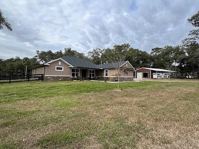 Unique opportunity awaits an Equestrian with the offering of this Brand New 3/3 Triple Crown home that has access to the renowned Florida Greenway Trail system. This private estate is completely fenced and has an electronic entrance gate. The custom home with open floor plan showcasing beautiful views from every window will satisfy all your wants and needs. The large kitchen boasting a wolf induction cooktop will making staying at home to eat a dream. As you look around the home you will notice a Split floor plan, dedicated office space , oversized primary bathroom shower and peaceful covered lanai are just a few more amenities you will love. The property also has two barns, one is brand new 4 stall with run outs and room for more, plus a dedicated tackroom & bathroom. Second barn is a 4 stall shedrow. If you have guests with RV's there are 3 hook up with power and septic! Everyone needs a huge 40x60 workshop with overhangs for equipment as well as a quonset hut with power and hook up for washer/dryer. 2 wells, House Generator, 3 power meters a Cabin with power and much more !! This equine estate has been well thought out and won't disappoint.