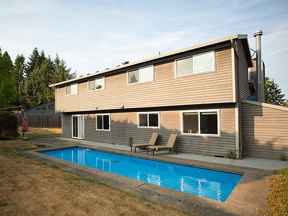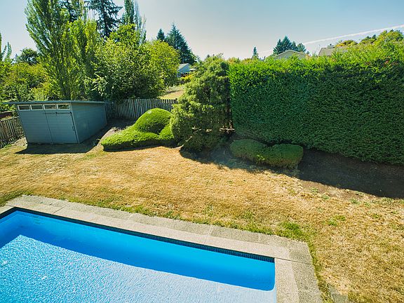 A true gem in the heart of Beaverton's coveted Greenway neighborhood, this fully remodeled, modern-style build sits in a quiet cul-de-sac on a fully fenced quarter acre lot that backs up to a city greenway. Hedges line the back of the property and enclose a 30-foot saltwater lap pool, making it a private and peaceful oasis. The pool is heated and usable June - October. The owner will have it covered in winter months. The home is lined with east and west facing windows, flooding the hand stained wood floors and vaulted ceilings with natural light from sunup to sundown.