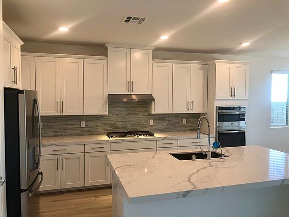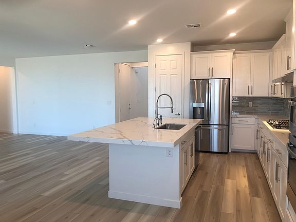 Upstairs, enjoy a large loft space ideal for a media room, office, or play area. Throughout the home, you'll find luxury vinyl plank flooring, a neutral color palette, and a designer kitchen with Carrera quartz countertops and stainless steel appliances, including a refrigerator.