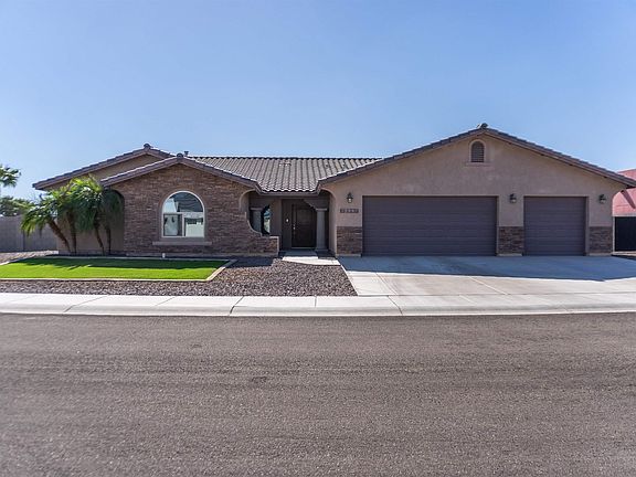 4-bedroom, 3 bath, 3-car garage on a corner, 10,221 sq ft lot! A welcoming stone-accented entryway guides you to an airy great room with vaulted ceilings, recessed lighting and easy-care tile flooring throughout the main living areas. The cook’s kitchen features granite countertops, a gas range, center island with pendant lighting, a walk-in pantry, and generous cabinet space. The primary suite includes double sinks, granite vanity, and a large walk-in closet. Low-maintenance backyard designed for Yuma living—covered patio, extended paver area, gravel landscaping, block fencing, and double gates for convenient side-yard access. Located near I-8 and shopping centers.