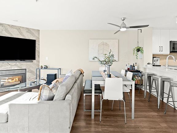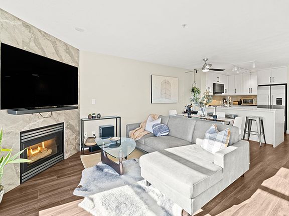 Sunny south-facing suiteInduction rangeSleek quartz countertopsWide-plank laminate flooringGas fireplaceSmart home lightingHeated floors