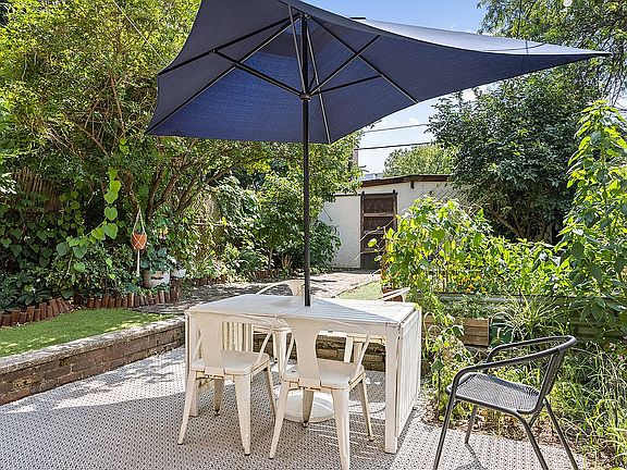 Entering at the garden level, an enclosed patio provides ample storage for bikes and other outdoor equipment before entering the home. Once inside, a cozy living room with a storage closet invites you to linger. Beyond, is the sunny and bright dining room with access to the backyard and an oversized window. Keep the two spaces separate, or combine for a large open concept living space to bring the stunning Southern light throughout the home. A sizable extension provides ample space for the eat in kitchen, currently featuring a mix of tile and butcher block counters, and a mix of open shelving and charming bead board cabinetry. A suite of white appliances including a french door, freezer bottom fridge and dishwasher complement the light and airy space that is washed in sun from two large picture windows. A full bath completes the floor.