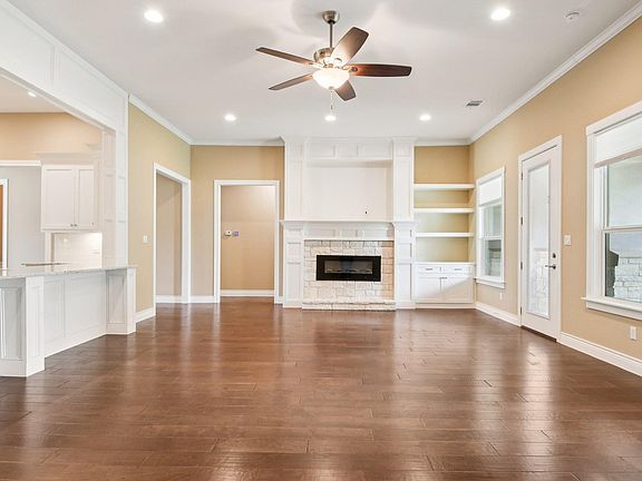 Stone fireplaceWrought iron fencingElectric insertHigh ceilings throughout houseGranite ctViews of the greenbeltCovered patio