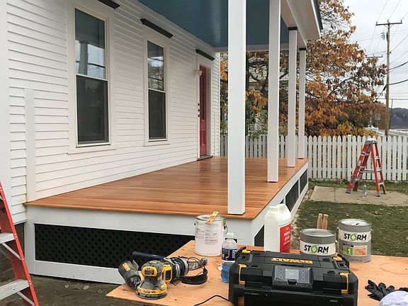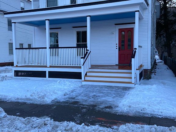 Light Airy Completely renovated Brand new refrigerator with ice maker Brand new 5 element range top with convection stove Brand new below the cupboards microwave Brand new quiet dishwasher Brand new washing machine and dryer in second bathroom with utility sink. Appliances are installed. This is NOT connections bring your own appliances. Brand new counters and flooring in kitchen Brand new bathroom with new sink and vanity Brand new master bedroom - new carpet and added a built in closet. Ceiling fans with lights in living room and master bedroom and second bedroom/office Covered porch in front. Covered porch in back. Extra soundproofing Must pay electronically No dogs/cats/pets No drugs Good references Rent includes oil heat, water, snow removal, trash & recycling You pay electric + internet 1 year lease