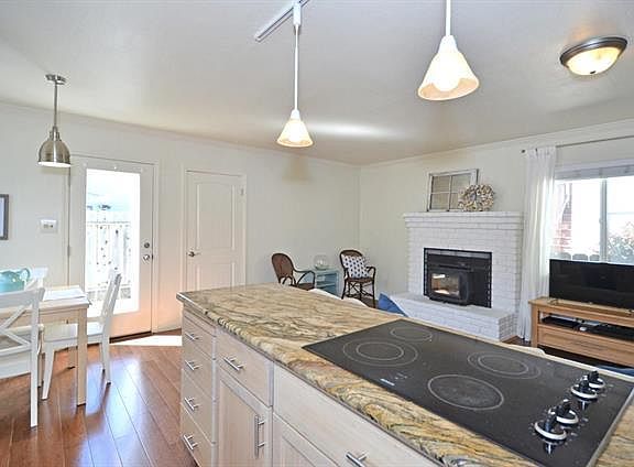 Affordable updated beach cottage on a sunny lot just steps to sand. Bonus room with French doors to the patio is potential 3rd bdrm. Charm & modern touches throughout. Open kitchen, living, dining area has prefinished hardwood floors, crown molding & access through a French door to a fenced outside patio. LR has a cozy fireplace w/ brick hearth. Kitchen features granite counters, custom subway tile backsplash, Bosch glass top range, maple cabinets, & French-door refrigerator. Between the living area & bedrooms is an alcove for a stackable washer/dryer, leading to a hallway, closet, & upgraded BA w/new fixtures & tiled bathtub/shower. BR's are carpeted, w/plenty of natural light. Sunny patio offers opportunities for lounging, or extra entertaining space accessible from the kitchen & LR. The homes location in Rio del Mar is easily accessible from Hwy One & just a short walk to the stunning coastline & beach, w/plenty of restaurants, coffee shops, & other amenities nearby.