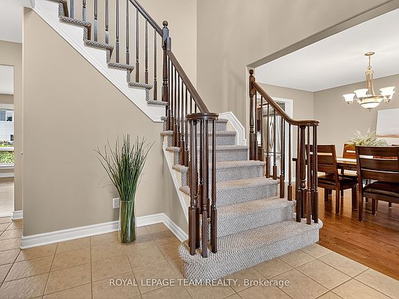 Welcome to this beautiful 2 Storey single-family home with large front porch, perfectly situated on a quiet cul-de-sac. Large pie-shaped lot with mature trees, located in a family-oriented neighborhood. This home features a double car garage with 2 auto garage door openers, convenient inside entry to mud room with main floor laundry. Main floor offers spacious living room with hardwood flooring throughout and central natural gas fireplace. Formal dining room, great for entertaining conveniently located next to well-equipped eat-in kitchen with ample cabinetry, breakfast bar, stainless steel appliances, under cabinet lighting, ceramic backsplash and flooring. Separate eating area with patio door access to spacious deck. Upstairs, you'll find three comfortable bedrooms, primary retreat with a walk-in closet and a 4-piece ensuite featuring a separate shower and relaxing soaker tub. A 4-piece family bathroom, also with ceramic tile flooring, serves the additional bedrooms. The lower level is unspoiled with a rough-in for a future bathroom, providing endless possibilities for additional living space or storage. Step outside to enjoy the large mature treed lot with a spacious deck perfect for entertaining or simply relaxing in the outdoors. This home is the ideal blend of comfort, style, and potential in one of Carleton Places most sought-after neighborhoods. 24 Hour Irrevocable on all Offers