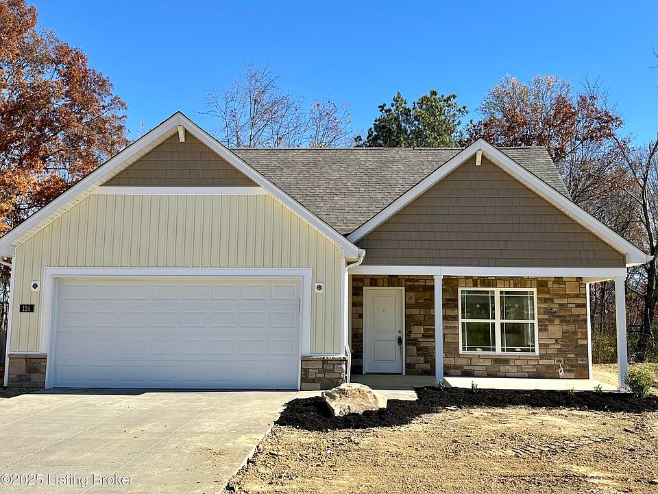 Welcome to this beautiful new home in Hillview, featuring an open floor plan and an array of desirable amenities. The impressive stonework and meticulous attention to detail, both inside and out, create a truly inviting atmosphere. The first floor offers a seamless flow between the living, dining, and kitchen areas, complete with abundant cabinetry and a large island, as well as a full appliance package. A conveniently located laundry room sits just off the garage and near the kitchen. The spacious first-floor primary bedroom includes a walk-in closet, double vanity, and walk-in shower. Upstairs, you'll find the secondary bedrooms and a full bath. A full-size door leads to the attic, providing excellent storage space.