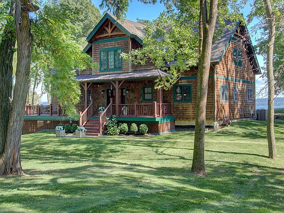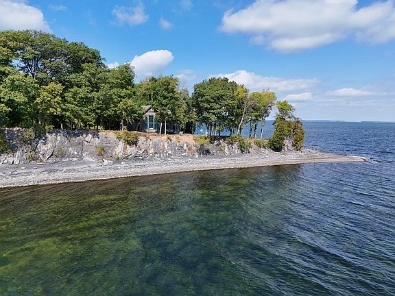 Secluded on a pristine headland, this rare estate enjoys over 650 ft of private shoreline and 270-degree views of the Green Mountains and the Inland Sea. Maple trees line the winding driveway past perennial gardens and wooded acreage. A gentle shale beach offers sheltered access to the water. Completed in 2016, this refined post-and-beam residence combines rustic elegance and modern style. Dramatic exposed timbers and a striking granite-hearth fireplace create a captivating centerpiece in the great room, while expansive windows frame the awe inspiring views. Gather in the open-concept kitchen and dining area , showcasing reclaimed oak floors, a grand 8-foot island, coffee bar, and pantry. Outfitted with professional-grade Thermador appliances, rich cherry and maple cabinetry, granite surfaces, and a farmhouse sink overlooking the Lake and Islands.The outdoor living areas are designed for relaxation and entertaining, featuring a sweeping wraparound deck, a 3 season porch with Douglas fir floors, and a bluestone patio. A welcoming family room is anchored by a Jøtul wood stove with an office or 4th bedroom completing this level. On the 2nd floor enjoy breathtaking lake views from the primary suite, complete with an ensuite bath with custom tile and a spacious walk-in shower. 2 additional guest bedrooms on the 2nd floor share a full bath, soaking tub and shower. The full walkout basement provides ample storage and the detached 3 car garage was designed for a 2nd floor ADU.