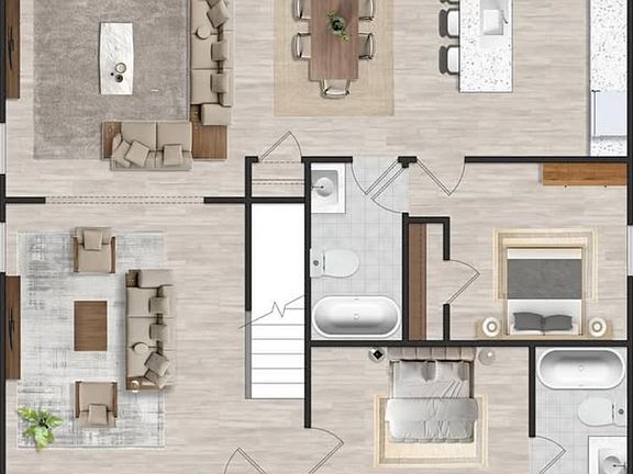 Entertainment Areas: Two full-sized living rooms and a dining room offer plenty of space to relax and entertain friends.