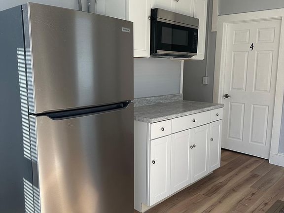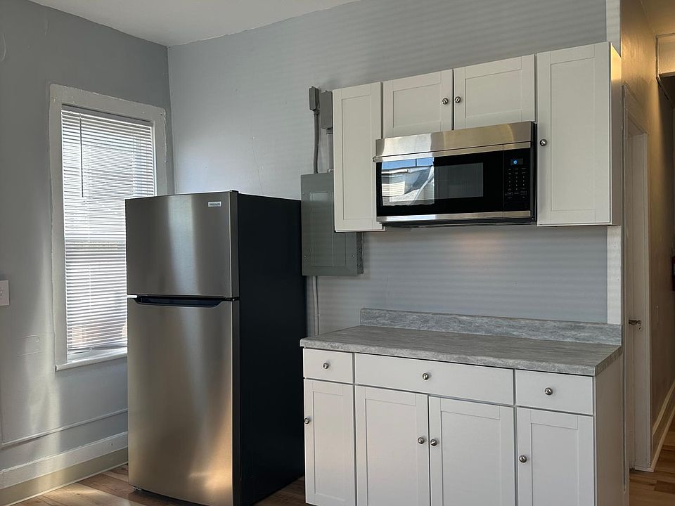 Brand new common kitchen with stainless steel appliances including full size fridge and microwave.