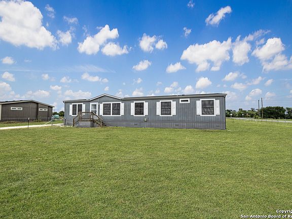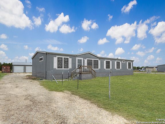 This thoughtfully designed manufactured home sits on over an acre in the established Galle Estates community, offering both privacy and convenience in the Texas Hill Country corridor. The strategic location provides easy access to three vibrant cities - Seguin, New Braunfels, and San Marcos - placing shopping, dining, entertainment, and employment opportunities within comfortable reach while maintaining a peaceful residential setting. The home's open floor plan creates seamless flow between living spaces, anchored by an island kitchen that serves as both a functional workspace and natural gathering point. Linoleum plank flooring extends throughout the main areas, providing durability and easy maintenance while delivering the warmth and character of hardwood. Four generously sized bedrooms offer flexible living arrangements, whether as bedrooms, home offices, or guest accommodations. Natural light fills every corner of this well-planned home, creating bright, welcoming spaces throughout the day. The primary suite features an indulgent soaking tub positioned beneath picture windows, transforming daily routines into relaxing retreats while providing views of the surrounding property. Two full bathrooms ensure convenience for busy households and overnight guests. Practical touches enhance daily living, from the solar screens that reduce energy costs and glare to the comprehensive gutter systems protecting both the main house and detached garage. The two-car garage extends beyond simple vehicle storage, offering additional space perfectly suited for workshop projects, seasonal storage, or hobby pursuits. The included refrigerator means one less detail to worry about during the moving process. The 1.206-acre lot provides room to breathe, whether for pets to play, gardening enthusiasts to cultivate their interests, or simply those who value space between neighbors. The fencing offers security and a safe zone for play or pets. USDA financing eligibility opens homeownership opportunities to qualified buyers, making this slice of Texas accessible to those seeking country living without the isolation.