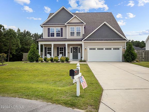 Now is your chance to call this spacious 2600+ square foot house a home! It is centered on a .33 acre lot and located at the edge of the neighborhood, on an unfinished cul-de-sac lot. It sits next to a vacant lot and over 400+ acres of untouched wooded property, which makes for quiet mornings and nights to enjoy from 2 covered patios. Downstairs you'll find an open floor plan with wood plank LVP throughout, windows that allow for plenty of natural lighting, a kitchen with an upgraded steel deep sink, an island for additional counterspace, and a half bathroom. You will also find 2 closets for storage and an oversized, double-door pantry. Upstairs you will find carpeted stairs, a large laundry room, a linen closet, access to the attic, and 4 large bedrooms. The oversized master bedroom and bathroom include a large walk-in closet. The 2-car garage includes sturdy, overhead metal storage racks. Outside you can enjoy views of the native wildlife and wooded landscapes. On the side of the property is an 8'x8' shed. This is an incredible community filled with great people and children of all ages. Easy access to Swansboro and Jacksonville for all your amenities. Approximate drive times to military bases from the home include Camp Lejeune (15-20 min), Bogue Airfield (30 min), MCAS New River (30 min), MCAS Cherry Point (50 min)