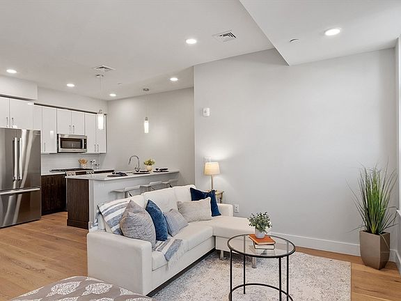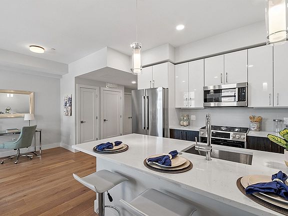 Sleek & Sophisticated Studio in "The Post". Newly constructed in 2023 this bright and inviting condo features 9' ceilings & modern high end design throughout. Expansive kitchen island, quartz countertop, Porcelanosa tile, Bosch appliances, gas range, GE washer and dryer and Navien tankless water heater. For added convenience, an elevator leads to a lower level bike storage room and a 6 x 5 secure storage locker. Professionally managed building with low condo fees. The Post is a 4 story residential development in the Spring Hill neighborhood of Somerville with the Gilman Square Green Line Station, #90 bus to Davis Square & Somerville Community Bike Path close at hand.
