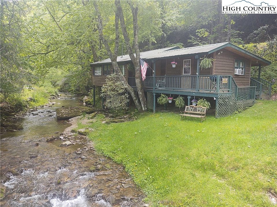 STUDENT RENTAL/LONG TERM RENTAL/VACATION RENTAL! Located a mere two miles from Boone, this mountain cottage sits on beautiful Goshen Creek. The roof and siding were updated in 2013. Home was remodeled with new carpet in bunkhouse. Flooring updated and painted. Heating upgraded to propane monitor in both buildings and window A/C units keep cool in summer. Sit and swing on the shaded, covered deck and watch the creek flow by. Access the adjacent bunkhouse only a few steps across the covered deck. As an added convenience, the bunkhouse has its own full bathroom. The bunkhouse adds an additional 223 square feet and enclosed porch adds another 134 square feet of usable space. No restrictions on rentals makes this property even more versatile. New kitchen countertop, sold partially furnished, exclusion list included