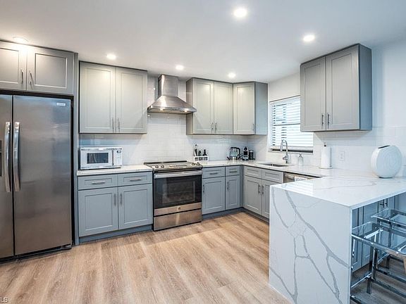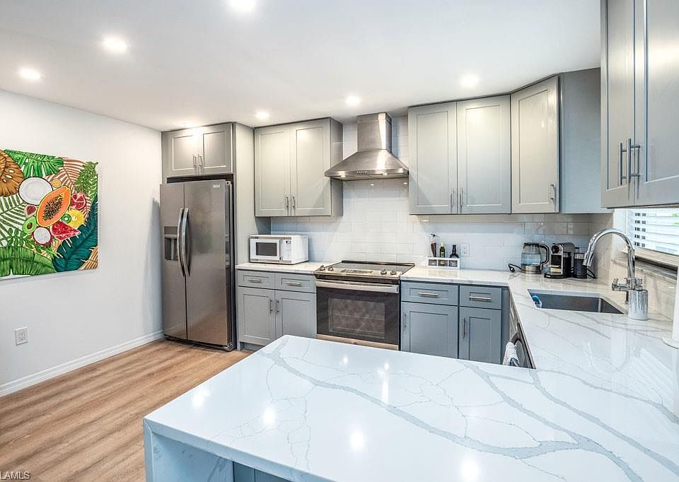 A fully renovated Townhome in Bayberry of Naples Florida. This stunning two bedroom, two full and one half bathroom property boasts updates throughout. NEW ROOF 2023. New water-heater /October 2024. The eat-in kitchen offers all new shaker style cabinetry, quartz countertops, subway tile backsplash, newer stainless steel appliance package, farmhouse sink, breakfast bar with storage and waterfall accent top. The master bathroom and guest bathroom share similar updates including, all newer vanities with quartz countertops, sinks and fixtures, fully tiled shower stall and tub surround and custom, fully automated shower heads. Laminate wood looking flooring throughout, recessed lighting in all the main living areas, light features, remote control ceiling fans with lighting, widened interior doorways, imported European interior doors. A large courtyard is a perfect space to entertain your family and friends. A community pool is just a few steps away from your home. Just minutes to Naples golden beaches, and it's the perfect inspiration to start writing a new chapter in your Naples history. Bayberry is not 55+ community.