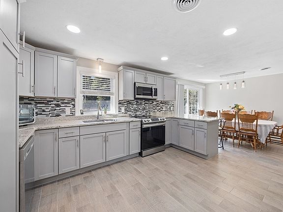 Open House Saturday 11:30-1:00. BEAUTIFUL RANCH! Set on over ¾ acre, this stunning 2023 renovation offers modern comfort and style throughout. Exterior updates include new vinyl siding, windows, roof, and landscaping. Inside, the bright open layout features a updated eat-in kitchen with granite counters, stainless appliances, and dining area flowing into a spacious living room with fireplace. Three large bedrooms and a beautifully renovated bath complete the main level. Sliders open to a large cement patio overlooking a private, tree-lined yard. The finished lower level adds approx. 1,000 sq ft of living space with a bar area, laundry, and full bath—perfect for entertaining or extended living. Freshly painted, with updated heating and central air. Move-in ready! Just 9 minutes (4.7 mi) to Franklin MBTA station—close to highway. An ideal commuter location! Subject to seller securing suitable housing.