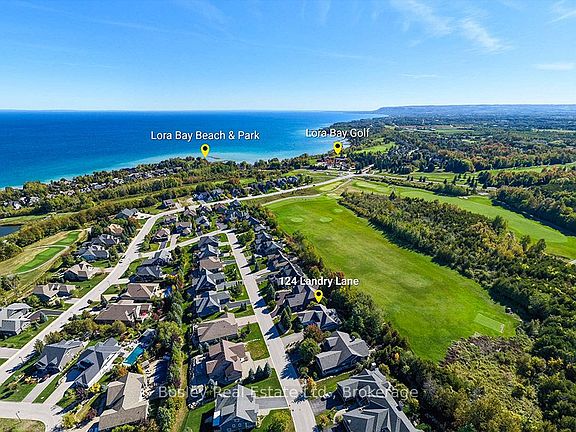 Introducing a stunning 5-bedroom custom residence by renowned builder Dezign2000, perfectly situated in the exclusive Lora Bay community. Backing onto the driving range and surrounded by mature trees and landscaped gardens, this home offers luxurious seclusion and refined living. Inside, wide-plank oak floors, soaring ceilings, and timeless design set the tone. The gourmet kitchen features white shaker cabinetry, granite counters, gas cooktop, and walkout to a private terrace. The great room impresses with vaulted ceilings, custom built-ins, and a dramatic gas fireplace. The main-floor primary suite is a tranquil retreat with garden access, walk-in closet, and a spa-like ensuite with heated floors, soaker tub, and glass shower. A formal dining room (or office), powder room, laundry with garage access, and oversized double garage complete the main level.Upstairs offers two guest bedrooms, a sitting area, and a beautifully appointed bathroom. The finished lower level expands your space with two more bedrooms, a den, spacious rec. room, bathroom with heated floors, large storage room, and cold cellar. Additional features include a built-in home audio system (ceiling and in-wall speakers, home audio connection), whole-house air purification system, brand-new furnace (March 2025). The exterior was fully painted in 2023.Outdoors, enjoy stone pathways, lush perennial gardens, and a private patio oasis. Just a short walk to the beautiful Georgian Trail system and minutes from Thornbury. Lora Bay residents enjoy two private beaches, championship golf, members lodge, dining, and curated social events. Indulge in a four season lifestyle that's sure to impress. Community fees (GCECC): $2,280/year.
