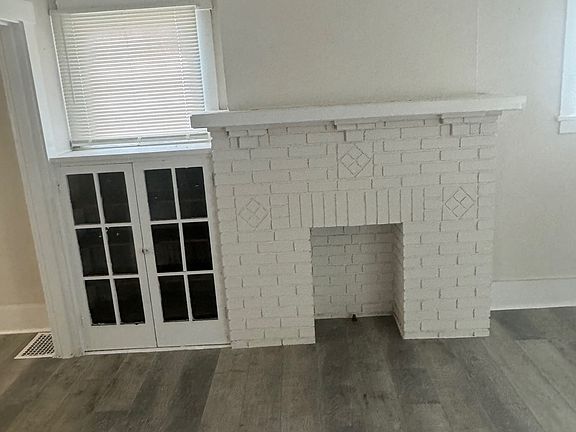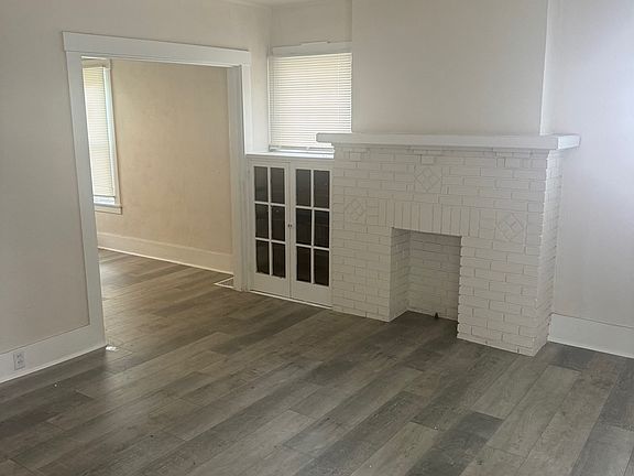 Built-in shelvesWood style flooringBright white paintHuge dining roomDecorative mantleBeige carpeting