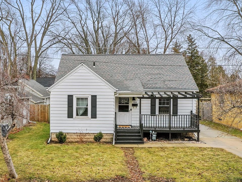 Cozy Cottage near parks, schools, and Resch Aquatic Center! 2BR/1BA 1-story welcomes visitors via front deck w/ pergola to living room with pecan-oak hardwood flooring, arch doorway, and charming accent wall. Fully-equipped eat-in kitchen includes all appliances, ample cabinetry, mosaic backsplash, and pantry, Bedrooms w/ character 2-panel doors & original hardware. Updated bath w/ modern vanity & fixtures. Vinyl windows throughout home. Step outside the back door to a paver patio, deck, and fully-fenced back-yard! 1-stall detached garage. Great central location near all amenities, and just up the road from Lambeau Field!