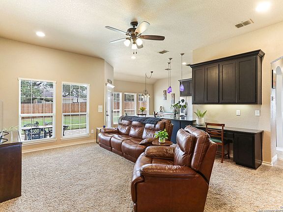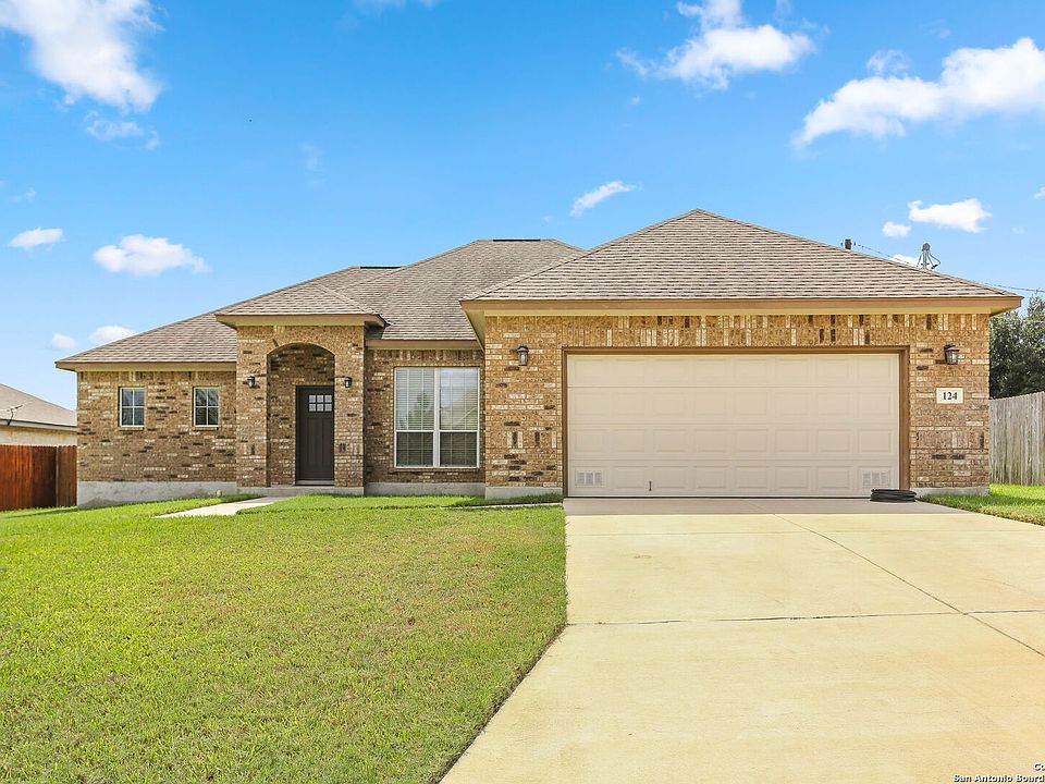 OPEN HOUSE: Saturday, November 1 (12pm - 2pm). Welcome to 124 Ridgecrest, a beautifully maintained 3-bedroom, 1-office, 2-bath home nestled on a quiet cul-de-sac in the desirable Northcrest Hills subdivision. Built in 2015 and thoughtfully designed as a retirement retreat, this single-story residence combines timeless charm, modern upgrades, and the ease of low-maintenance living. With 1,860 sq. ft. of living space (2,402 sq. ft. under roof), it offers a comfortable and flexible layout perfect for both daily living and entertaining. Step inside and you'll be greeted by high ceilings, abundant windows, and custom cabinetry throughout, creating a light-filled and inviting atmosphere. The living room and primary suite feature new ceiling fans, while plush carpet with extra-thick padding adds warmth and comfort. The primary suite is a private retreat with barn doors, a deep 6' soaking tub, and an oversized spacious vanity, perfect for organization and daily routines. The home also offers a dedicated office space, ideal for remote work or study. A well-designed kitchen includes a new oven hood, garbage disposal, and convenient E-center for organization, paired with durable finishes. This home is as practical as it is beautiful, with recent updates including a new 50-gallon water heater with expansion tank and outside drain (2022), a new water softener (2022), upgraded HVAC with UV light and overflow switch, and a reinforced garage door spring. The full-brick exterior, stand-up attic, and extended cement patio add value, while lush St. Augustine grass enhances curb appeal. Every upgrade was selected for durability, efficiency, and peace of mind.