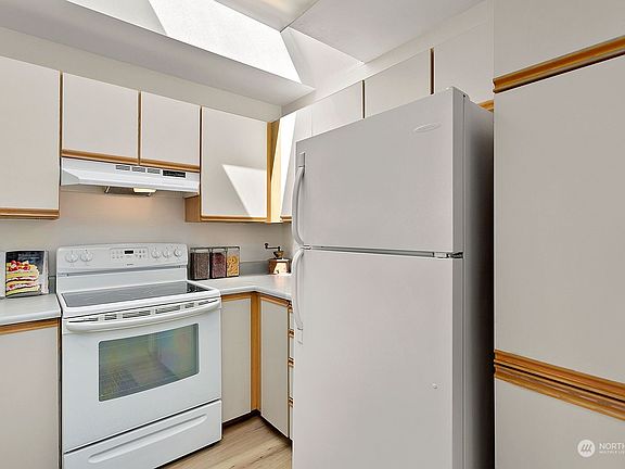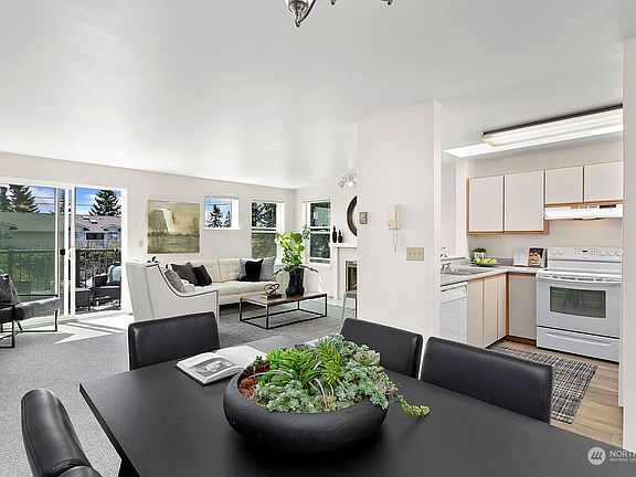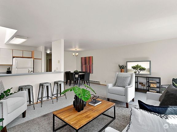 Immerse yourself in modern comfort with this exquisite top-floor condo in a serene three-story walk-up. Recently updated, the unit boasts new carpet, fresh paint, and pristine flooring throughout. The expansive living space is enhanced by an inviting wood-burning fireplace, perfect for cozy evenings. Enjoy tranquility in this end unit, ensuring peace and quiet. With a generous 953 square feet, this spacious haven features two bedrooms and two baths for ultimate convenience. Gaze out the windows to a breathtaking view of majestic Mt. Rainier, adding natural beauty to your everyday. Don't miss the chance to own this updated gem, offering both contemporary elegance and stunning scenery.