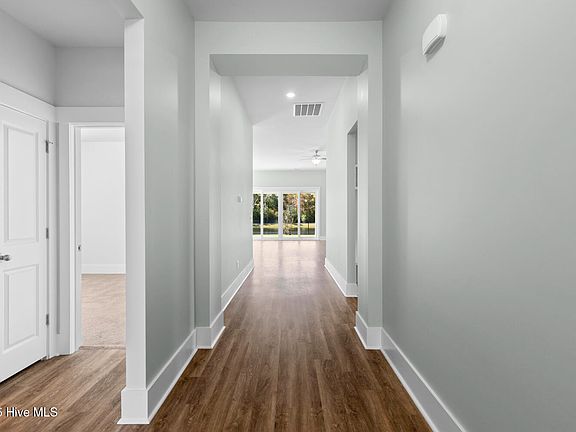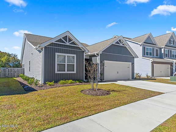Refined Coastal Living! Experience the epitome of modern coastal luxury in this immaculate residence, perfectly positioned just moments from the bridge to Surf City's pristine beaches. From the moment you arrive, the home's curb appeal and quiet road sets the stage for the beauty that awaits within. Step through the front door into the foyer, footed with LVP flooring, with a seamless flow that welcomes you into the heart of the home. The open-concept living and kitchen area exudes effortless elegance, an entertainer's dream. The gourmet kitchen features sleek grey cabinetry, polished granite countertops, a timeless white subway tile backsplash, and stainless-steel appliances. A deep single-basin sink and thoughtfully designed layout make both cooking and hosting a pleasure. Just beyond, the sunlit dining nook offers serene views of the fenced backyard and tranquil pond making it an idyllic setting for morning coffee or evening gatherings. Retreat to the luxurious primary suite, where comfort and style intertwine. Enjoy a spacious walk-in closet and a spa-inspired ensuite bathroom, complete with modern finishes designed to create a sense of calm and indulgence. Open the elegant French Sliding doors to your private covered patio and unwind as you take in the pond's reflection. This is truly a personal outdoor sanctuary. The expansive fenced yard offers ample space for entertaining, play, or quiet moments of relaxation. This clean, energy-efficient home enhanced by solar panels, blends elegance, sustainability, and convenience. Perfectly situated within walking distance to local dining, shopping, and entertainment, it represents the best of Surf City living! Coastal charm elevated by modern sophistication.