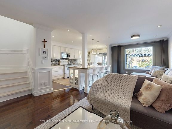 Welcome Home to 124 Thicket Cres - A Stylish and Spacious Linked Home with Modern Luxury FinishesStep inside this beautifully renovated 3 bedroom, 4 bath home showcasing refined craftsmanship and elegant details throughout. The open-concept main floor features rich hardwood floors, custom wainscotting, pot lights, and a bright layout that flows seamlessly from the living room to the gourmet kitchen. Entertain in style around the oversized granite island with breakfast bar, enjoy the upgraded cabinetry, glass backsplash, and stainless steel appliances - a true chef's dream.Walk out from the dining area to your private backyard retreat featuring a covered patio perfect for outdoor dining and relaxation. The upper level boasts three generous bedrooms including a luxurious primary suite complete with a walk-in closet and spa-inspired ensuite offering dual vanities, chandelier lighting, and an oversized glass shower. Modern finishes, designer fixtures, and a bright airy ambience make this space feel like a true retreat.The finished basement adds valuable living space with a recreation room, office nook, and 4th bathroom - ideal for a home gym, media room, or guest suite. Tasteful upgrades throughout include a custom glass-panel staircase, crown moulding, and updated lighting that enhance the home's sophisticated character.Situated in a quiet family-friendly neighbourhood close to parks, schools, shopping, and transit. This turn-key home offers the perfect blend of modern comfort and timeless style - just move in and enjoy!