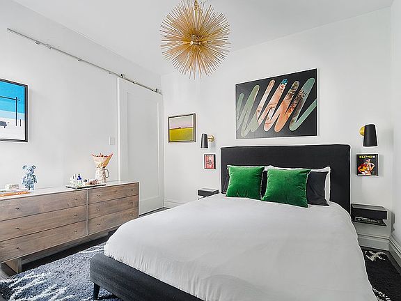A dramatic 23’ long foyer leads into the corner entertaining space with an open kitchen, living room and dining area with room for six or more, and a custom-outfitted bar. The kitchen is outfitted with marble countertops, a Wolf induction range, and Miele oven. Opposite the dining area is a full windowed bathroom with marble flooring. The primary suite has an en-suite bathroom and a very impressive windowed walk-in closet with a washer and dryer. Across the hall is the second bedroom, which is also well-suited for a home office.