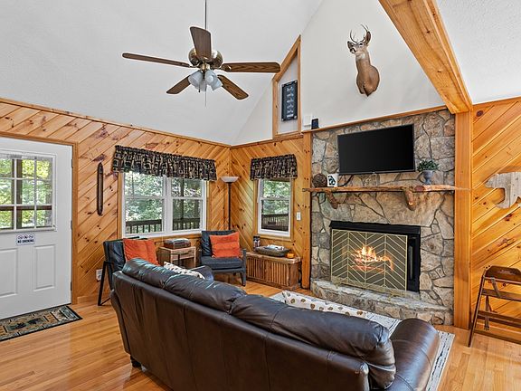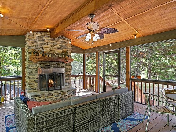 **Secluded Rustic Retreat in the Heart of Nature** Private 3-bedroom, 3-bathroom cabin, perfectly nestled on a 1.29-acre tract adjacent to the National Forest and Coopers Creek Wildlife Management Area. With almost 2,000 sq. ft. of heated living space, this cabin offers the perfect blend of rustic charm and modern comfort. The great room features a stunning stone fireplace, creating a cozy ambiance for family gatherings. Enjoy the outdoors from the wrap-around porches or the screened porch, complete with an outdoor fireplace. The home boasts double master bedrooms, each with its own bath—one conveniently located on the main level and another suite upstairs. A spacious loft area provides additional sleeping quarters, while the terrace level offers a large recreation/living area with a gas fireplace, a full bath, and a third bedroom. The walk-out terrace level seamlessly connects indoor and outdoor living spaces. Located in a rental-friendly neighborhood with seasonal views, this home is perfect for those seeking a peaceful retreat or a lucrative rental investment. Only a short, scenic drive to Blue Ridge, Blairsville, and Dahlonega. Embrace the tranquility and beauty of nature in this exceptional property.