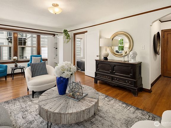 Enjoy a treetop perspective from this top-floor corner unit, elevated above a quiet, tree-lined street and bathed in natural light from abundant windows – 9 to be exact! Historic period details with original oak hardwoods, rich millwork, & coved ceilings. Yet, this home is beautifully updated where it counts with a clean, modern kitchen and stylish bath. SECURE GARAGE PARKING – a rare and valuable find in the neighborhood – completes the package. Queen’s Court is a well-maintained building positioned in the heart of Lower Queen Anne. With a 97 Walk Score, it’s just one block to Climate Pledge Arena and Seattle Center, not to mention countless amenities. Pet-friendly HOA with community garden, library, laundry room, & assigned storage space.
