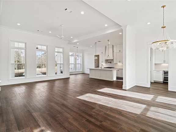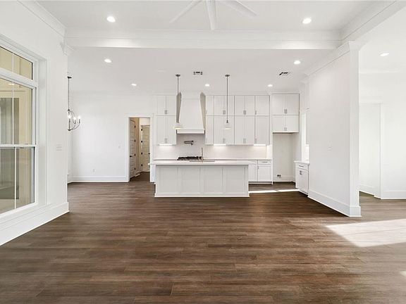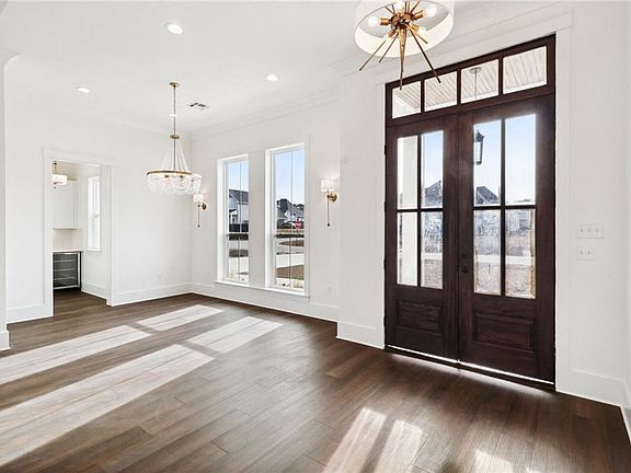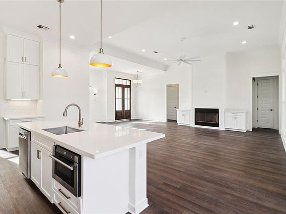 Stunning new construction in demand Abita Ridge! Chic white painted brick with board and batten details and copper-look awning, situated on one of the largest lots in the development, backing to the pond and reserved greenspace! Interior features include luxury laminate wood flooring throughout, NO carpet, upscale lighting package, closet systems in all closets, oiled bronze door hardware, two fireplaces, 10', 11' and 12' ceilings and more! Great room with wood burning fireplace with wood beam mantle flanked by built-ins. Formal dining plus breakfast room. Open kitchen with stainless appliances including a 36' gas range with pot filler, under counter task lighting, Quartz counters and full tile backsplash. Extra large pantry plus convenient butler's pantry with beverage cooler. Spacious primary with spa-like bath including stand alone tub and shower. Guest ensuite plus two other bedrooms are all on separate wings so there is plenty of privacy for everyone. Huge laundry room with sink and quartz countertops, office nook, two car attached garage. Large covered patio with outdoor ventless gas fireplace expands your living and entertaining! Hard HVAC ductwork, tankless water heater, security system, privacy fencing and more. Flood zone B with elevation of 18.7 feet. Compelling new price!