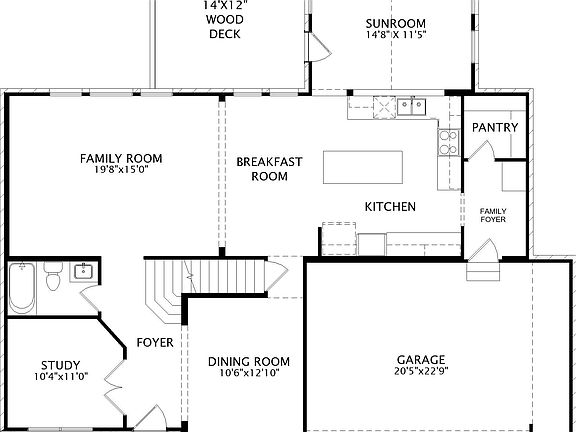 Clean, modern lines characterize the Quentin floor plan. The study just off the main foyer is perfect for working from home. Full bath on first floor for future guest suite. Formal dining room flows into the spacious kitchen, with large island and upgraded kitchen package. The breakfast room and kitchen flow easily from the family room, reflecting how families really live today. The sunroom off the kitchen is great overflow space for entertaining, relaxing or additional dining space. Large deck off the sunroom leads down to the finished recreation room with ½ bath in the lower level. The upstairs landing opens into the bonus room with four generous bedrooms, including the plush owner's suite, wrapping around it. All bedrooms have considerable walk-in closets and the owner's bath has the luxurious garden tub. And what's not to like about the upstairs laundry? On a large homesite, this home will be perfect for your back yard parties!