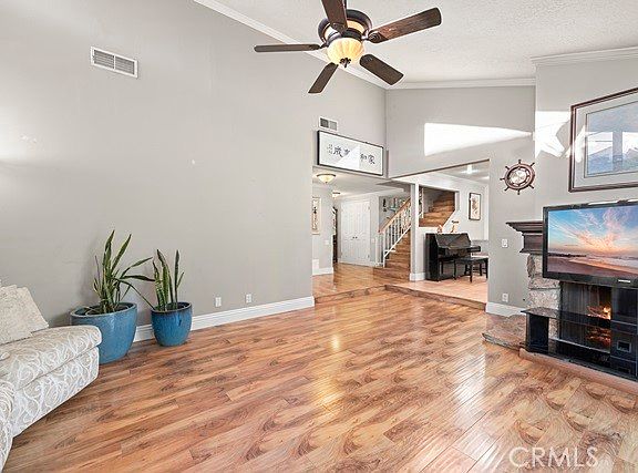 3 Spacious Bedrooms, 1 3/4 Baths (1,882 Sq.Ft.). Located on a cul-de-sac just below La Habra Heights. Open floor plan with a vaulted ceiling. Dual pane windows, sliding doors and Laminate floors throughout. The Master Bedroom is located downstairs and has a vaulted ceiling and large close. The Master Bathroom has a frameless glass shower door, Quartz countertops and white cabinets. The Living room includes a fireplace, vaulted ceiling, dual pane windows and sliding doors. Recessed lighting in kitchen. The Kitchen overlooks the backyard. It includes Granite countertops and a walk-in pantry. Mirrored closet door in upstairs bedrooms. Inside laundry area. Central air conditioning and forced air heating. The well-manicured backyard is perfect! The backyard has a large flat grass area, covered patio, a raised wood deck and play area for the kids. Two car attached garage with roll up door. Close to 57 & 60 freeway, schools, Loma Norte Park and Shopping.