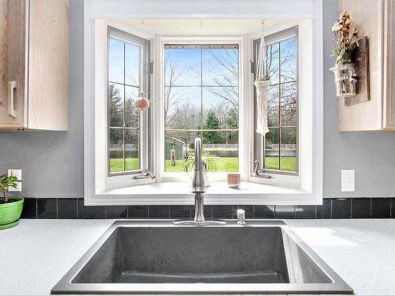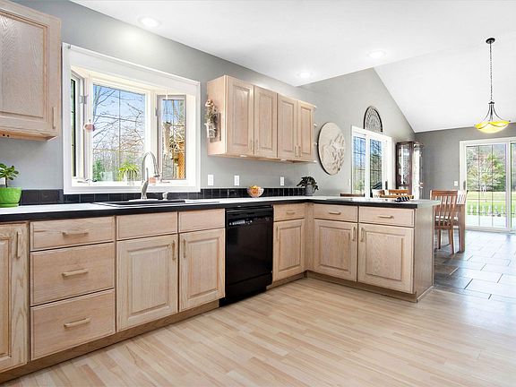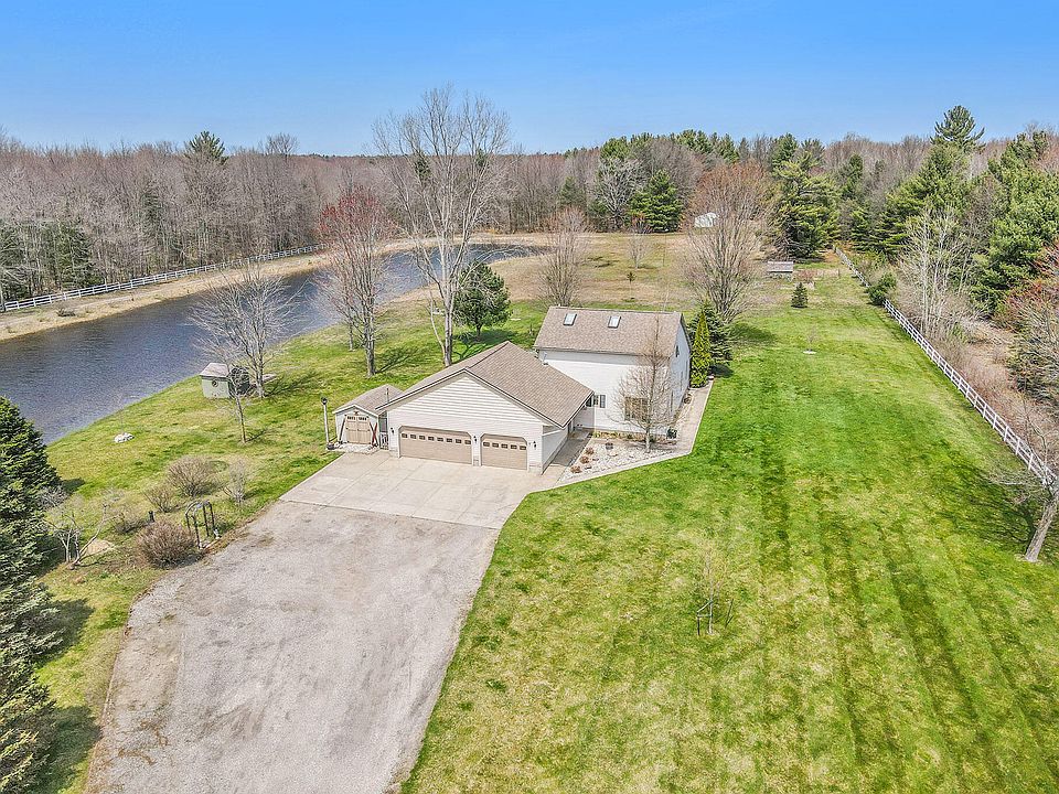 Look no further for your own personal oasis! Situated on nearly 8 acres in Reeths Puffer school district close to the lakeshore with a fully stocked 2 acre pond this home checks all the boxes. The sun-flooded 2-story vaulted living room hosts the heart of the home complete with a cozy pellet stove. Perfect for entertaining, the dining room with dual doorwalls to the expansive deck opens to both the kitchen and living room creating the perfect flow. The refreshed chef's kitchen boasts impressive counter and storage space and an eat-at snack bar. Private second floor primary suite with skylight, fresh paint, brand new carpeting, walk-in-closet and attached bathroom with updated vanity and jetted tub. Main floor also features laundry, 2nd bedroom and full bathroom. From the privacy of your deck you will enjoy the incredible perennial gardens and fire pit on summer nights. Also included: Custom Amish built workshop, 16x34 pole barn, garden shed and irrigation pump house. Make your dream a reality!