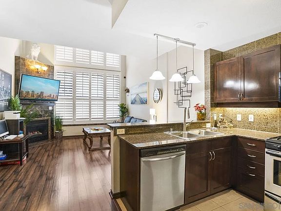 Experience the best of downtown living in this two-story loft, ideally located in San Diego’s sought-after Columbia District—just steps from Little Italy, the waterfront, and the city’s top dining and entertainment destinations. This bright and spacious 1-bedroom, 1.5-bath home offers a spacious two-story floorplan with nearly 1,000 square feet of living space. Soaring 18-foot ceilings and floor-to-ceiling windows create a sense of openness and provide ample natural light. On the main level, the large kitchen has ample cabinet space and is open to the spacious living room, which includes a gas fireplace. Also, on the main level, there is a half-bath. Upstairs, a generous loft-style bedroom offers privacy and includes a full bathroom. The home is located on the first floor, and the entry is on the interior of the building, giving you an additional level of privacy and convenience. This home is available fully furnished, making it a turnkey option for a primary residence, second home, or investment property. Located in the TREO community, you’ll enjoy resort-style amenities, including a pool, spa, BBQ area, community room, fitness center, front desk attendant, and 24-hour security—all with reasonable HOA dues. Just two blocks from Waterfront Park and minutes from Petco Park and the Gaslamp Quarter, this location truly has it all. Don’t miss your chance to own a rare urban gem in one of San Diego’s most vibrant neighborhoods!