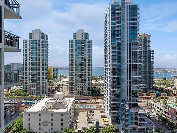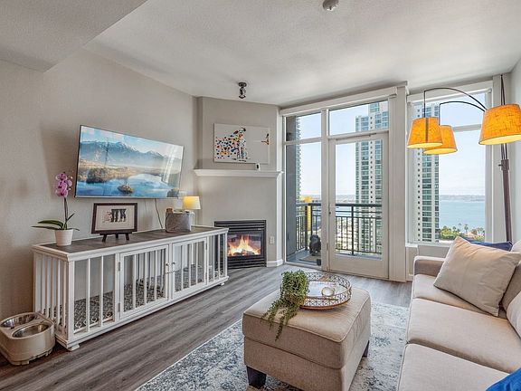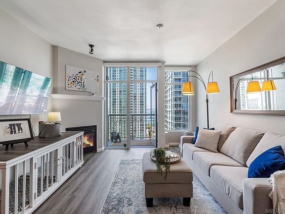 This stunning Treo townhome offers breathtaking bay views and an expansive layout perfect for entertaining. The main level welcomes you with an open-concept great room, featuring a modern kitchen equipped with stainless steel appliances, quartz counters, an extended island and ample storage. The dining area flows seamlessly into the living room, which features a cozy fireplace, luxury vinyl tile flooring, and floor-to-ceiling windows that flood the space with natural light and showcase mesmerizing water and city light views. Upstairs, you'll find two generously sized bedroom suites and a convenient laundry area. The Primary Suite offers the same awe-inspiring views. This home also includes two dedicated parking spaces. Amenities include 24-hour, front desk attendant, pool, spa, gym, community room, BBQ areas and a package room so you Amazon deliveries don't get lost. Situated just steps from Little Italy and the San Diego Bay, Treo offers exceptional value among downtown San Diego buildings. The unparalleled level of service and amenities comes at an impressively low monthly HOA fee. Inside the unit, you'll find a spacious storage closet tucked beneath the staircase.